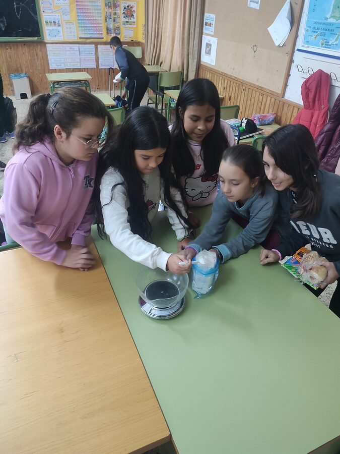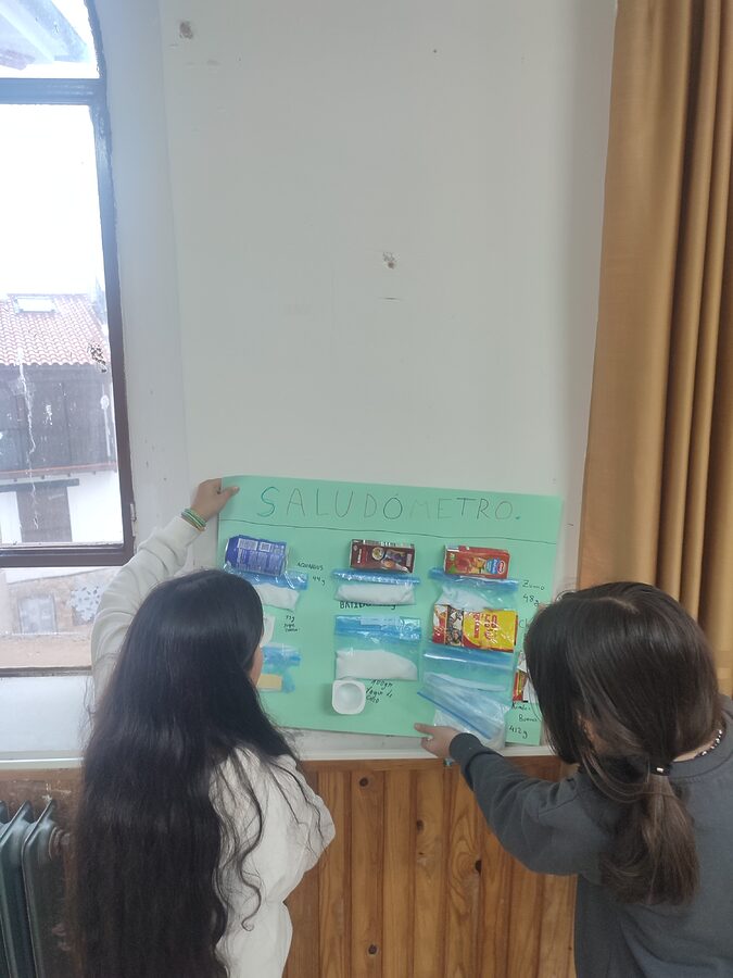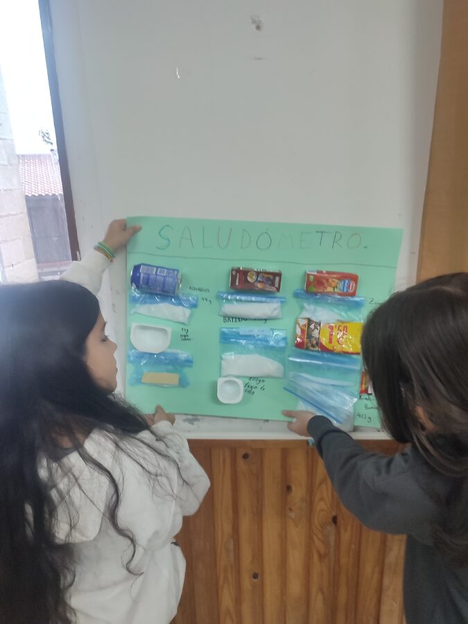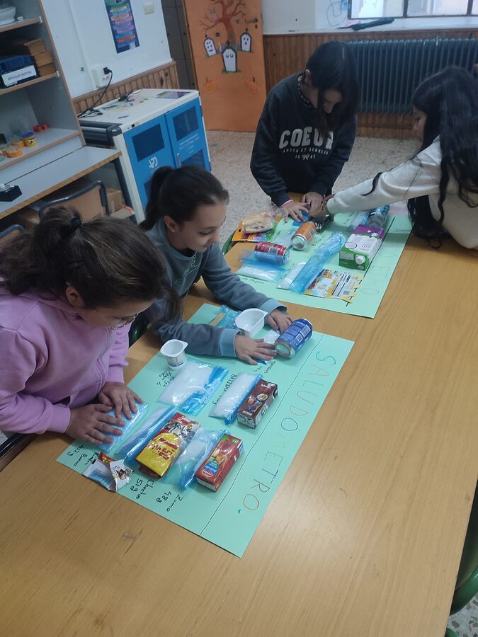 3º Posteriormente fuimos calculando cuanto azúcar tenía cada producto 1l/gr. Para ello utilizamos una báscula de pesaje de alimentos. Una vez determinado la cantidad de azúcar lo metimos en una bolsita y añadimos dicha bolsita con su envase al mural del SALUDÓMETRO.